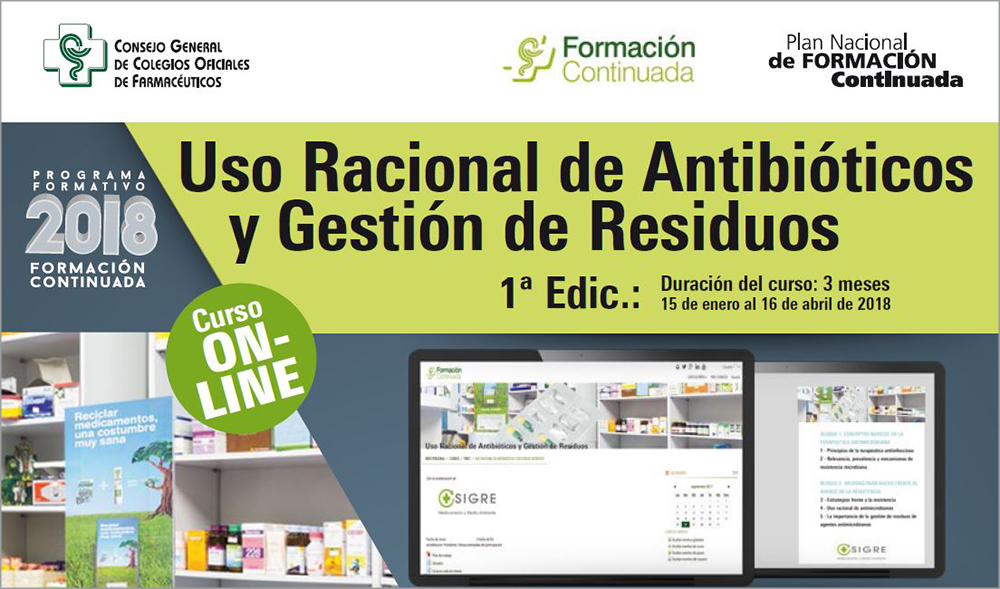 La aparición de resistencias bacterianas es, en la actualidad, una de las principales preocupaciones en materia de salud pública. Conscientes de ello, el Consejo General de Colegios Oficiales de Farmacéuticos (CGCOF), con la colaboración de SIGRE, ha creado un curso online sobre ‘Uso Racional de Antibióticos y Gestión de Residuos’, de inscripción gratuita para todos los farmacéuticos colegiados.