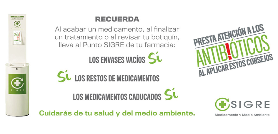 hace un llamamiento a pacientes y cuidadores para que lleven los restos de antibióticos al Punto SIGRE de la farmacia al finalizar los tratamientos, para evitar que lleguen al medio ambiente y contribuyan a la generación y transmisión de las resistencias bacterianas.