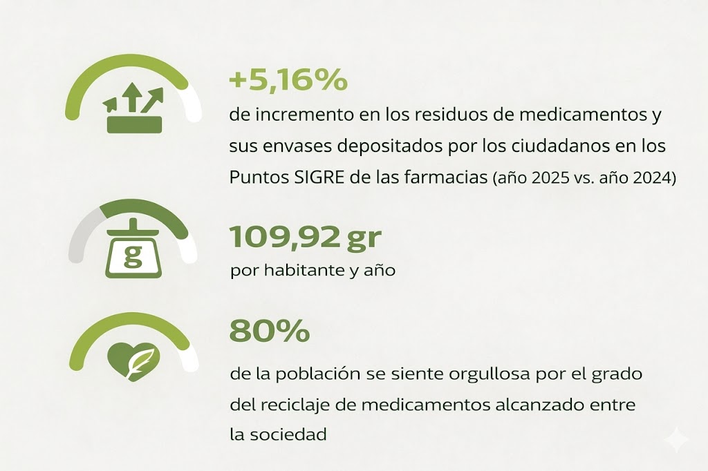 Una buena muestra de esta evolución positiva es que en 2025 la recogida selectiva de envases vacíos o con restos de medicamentos depositados en los Puntos SIGRE de las farmacias españolas experimentó un crecimiento superior al 5 %.